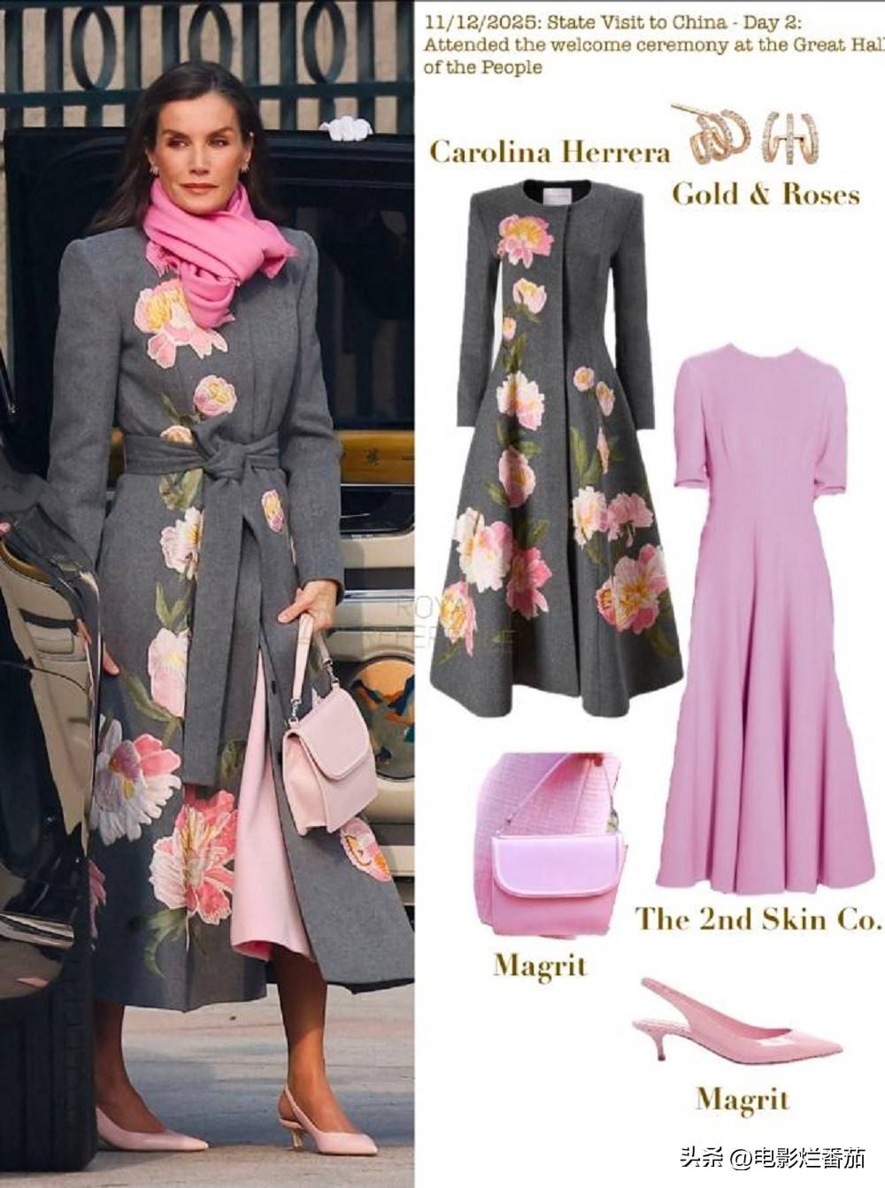而莱后此行最惹眼的一套衣服,当属出席接待晚宴的那件刺绣大衣,大衣上绣的是大家默认的“准国花”——牡丹,也算是把中国元素穿在了身上。穿这件大衣出席中方的接待晚宴,是莱后主动亲近的体现。