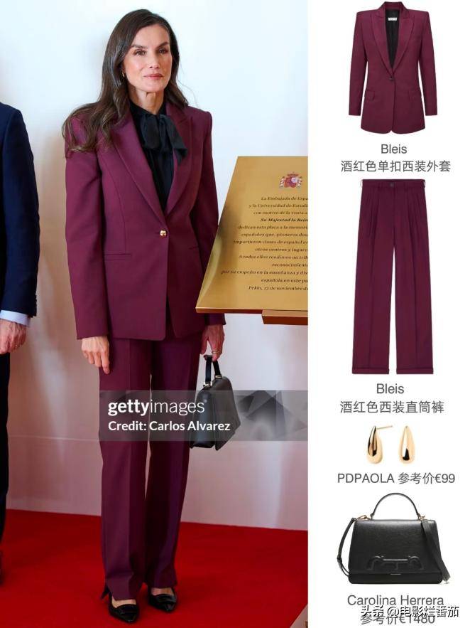 除了以上较为有特色的穿搭外,莱后还演绎了两套较为商务的穿搭,橄榄绿连衣裙和酒红色西服都被她穿得简约利落。