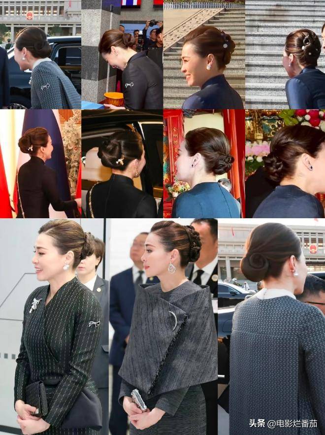 首先,是发型上,虽然整个访问过程,大家看到苏提达似乎都是同一个盘发造型,但其实仔细看,就会发现,每一个盘发的发包造型都不一样,而且还会搭配精致的小发饰,相当用心。