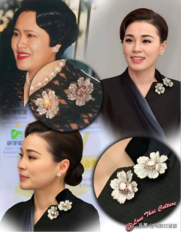 比如:她在访华期间佩戴的这两枚钻石花朵胸针,王太后在世期间,花蕊用的是黄色和红色的宝石镶嵌而成,而苏提达继承后,则把花蕊全部换成了更素雅的水钻。