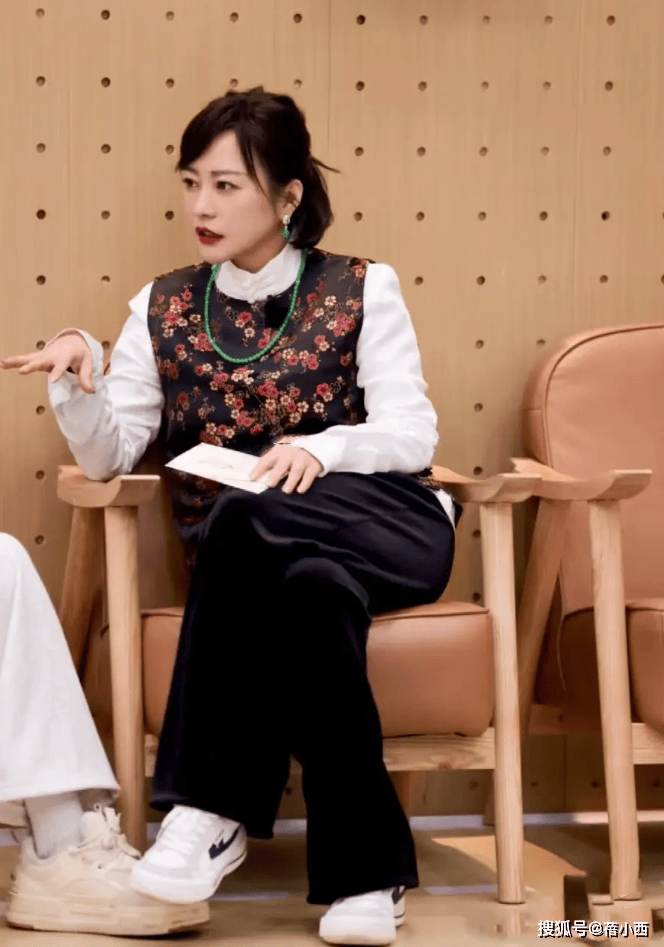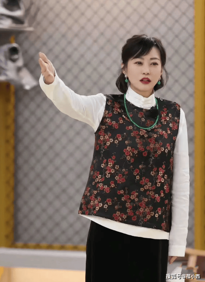 此时,复古风潮正席卷而来,许多女性纷纷追随其后。郝蕾则以一袭白衬衫与印花马甲的搭配,将传统与现代相融汇。黑色的阔腿裤与白色平底鞋的搭配,更是将舒适与气场完美结合。简洁之中,尽显优雅,而外面的马甲则以复古刺绣点缀,红金色的花纹仿佛奉上了不同寻常的贵气。