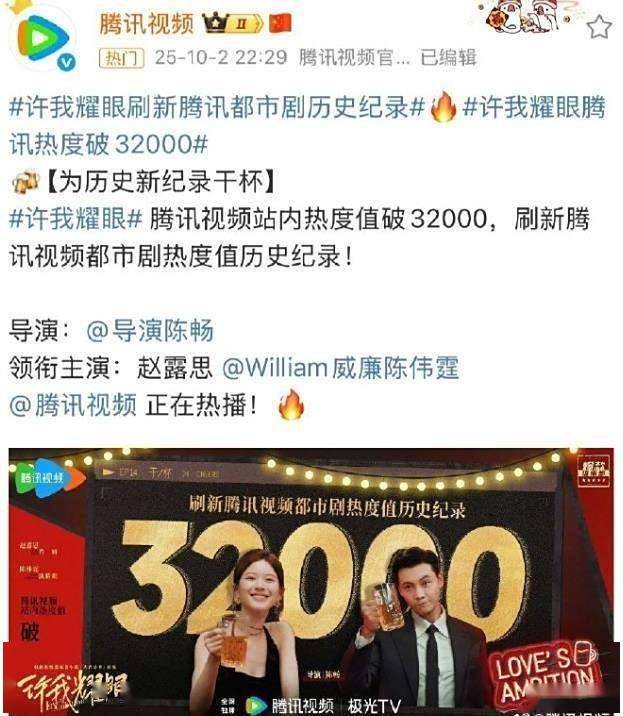在如今影视剧层出不穷的时代,一部剧想要突出重围,收获高热度并非易事。然而,近期一部名为《许我耀眼》的剧集却在腾讯视频大放异彩,热度成功突破32000 ,这一成绩着实令人惊叹。要知道,腾讯视频作为国内头部视频平台,剧集资源丰富,竞争激烈,能在此斩获如此佳绩,足见《许我耀眼》的非凡魅力。这不禁让人好奇,它究竟凭借什么吸引了众多观众的目光,在短短时间内就积攒起如此高的人气?接下来,就让我们一同深入探寻这部剧爆火背后的秘密。