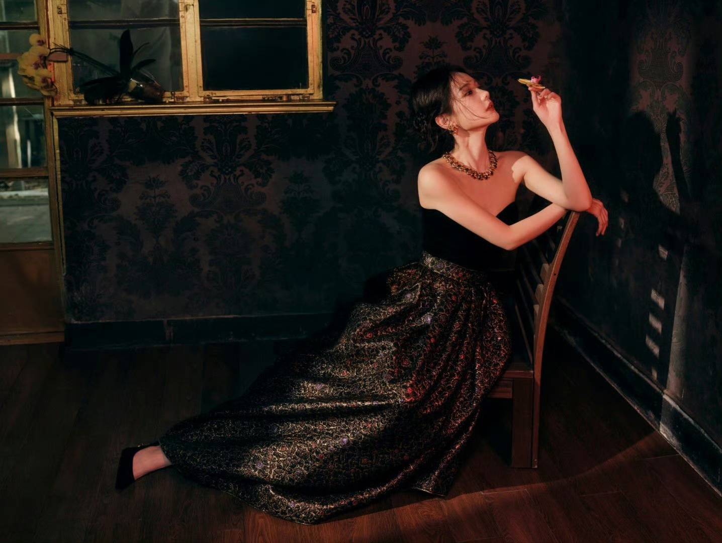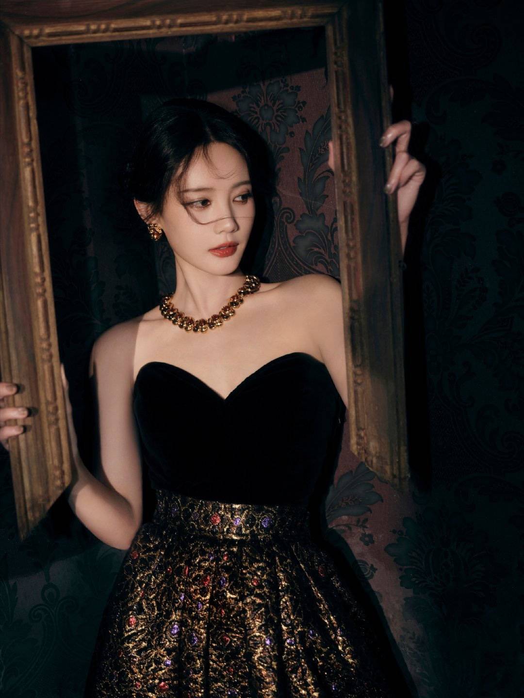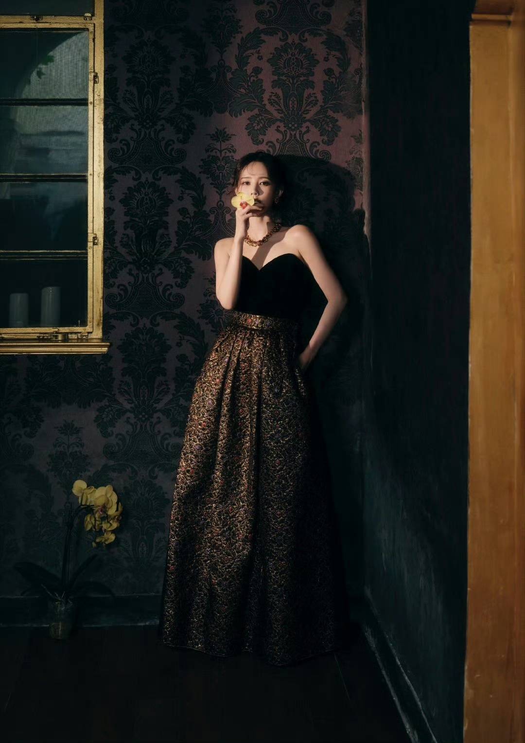 礼服整体设计为黑色丝绒抹胸搭配金色提花伞裙,采用了线K金线手工刺绣,领口还精心镶嵌了珍珠,处处散发着复古奢华的气息。金色丝线在灯光的映照下熠熠生辉,仿佛暗涌着无尽的贵气。抹胸设计则巧妙地凸显了李一桐优美的肩颈线条,将东方骨相与西方廓形完美融合,展现出独特的魅力。