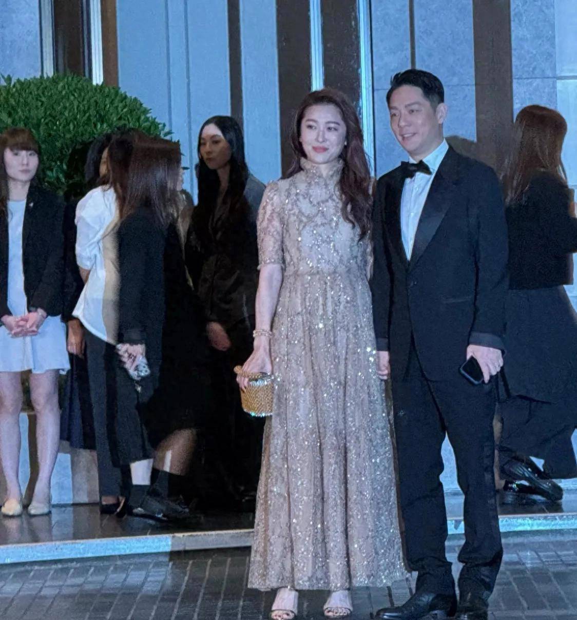 阿娇的身形又瘦回来了,那晚她穿着一袭黑色深V丝绒长裙,出现在晚宴现场时,气色真不错,美得格外耀眼又自信。她和关智斌站在一块儿,她的肩膀紧挨着他的,两人看着特别般配。