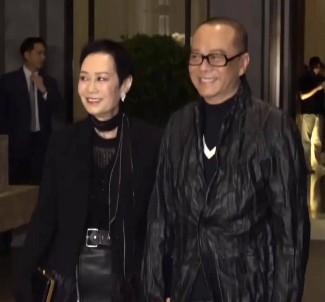 吕良伟和第三任太太梁小娟一块儿参加晚宴。他穿着皮夹克,搭配一条红领带,看着依旧很有型挺帅,法拉利虽然旧了,但还是法拉利嘛。梁小娟打扮得很讲究,气派十足,吕良伟在镜头前一直牵着她的手,呵护有加,俩人看着特别恩爱。