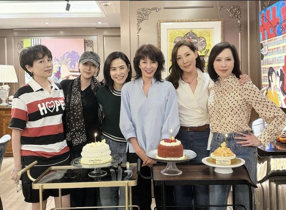 “六美”围坐一圈,香槟的气泡在高脚杯里翻腾。宣萱一身轻松打扮,牛仔裤配白色 T 恤,利落又自然,切蛋糕时银手镯在腕间轻轻摇曳,那是姐妹们早年送她的礼物。郑裕玲依旧干练,黑色西装配珍珠项链,举杯笑道:“今天只说开心的事。”刘晓彤与丘凯敏则凑在一起翻看旧照,笑声细碎。
