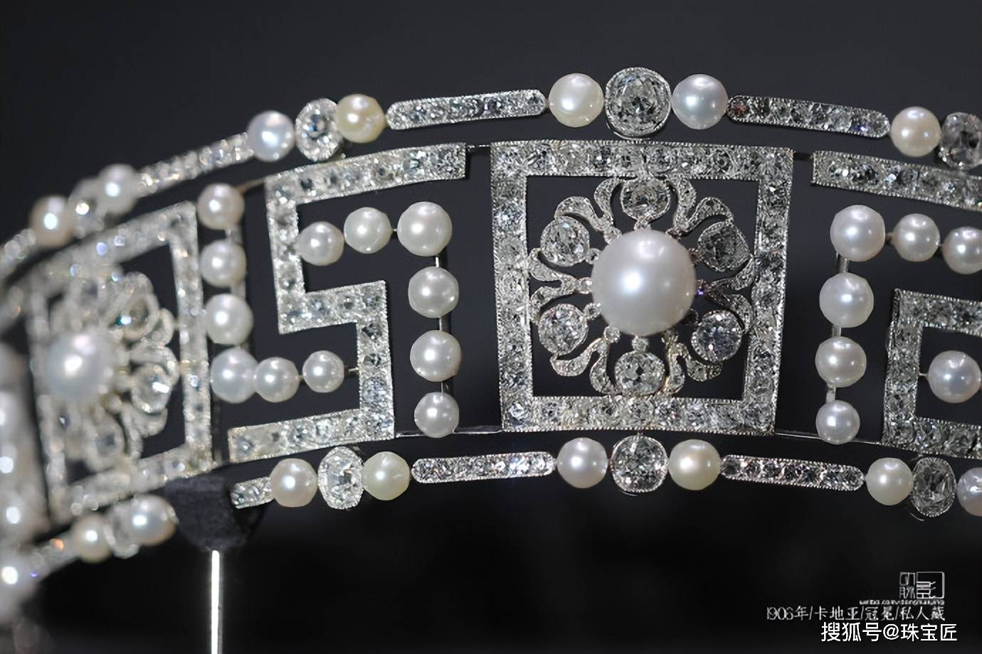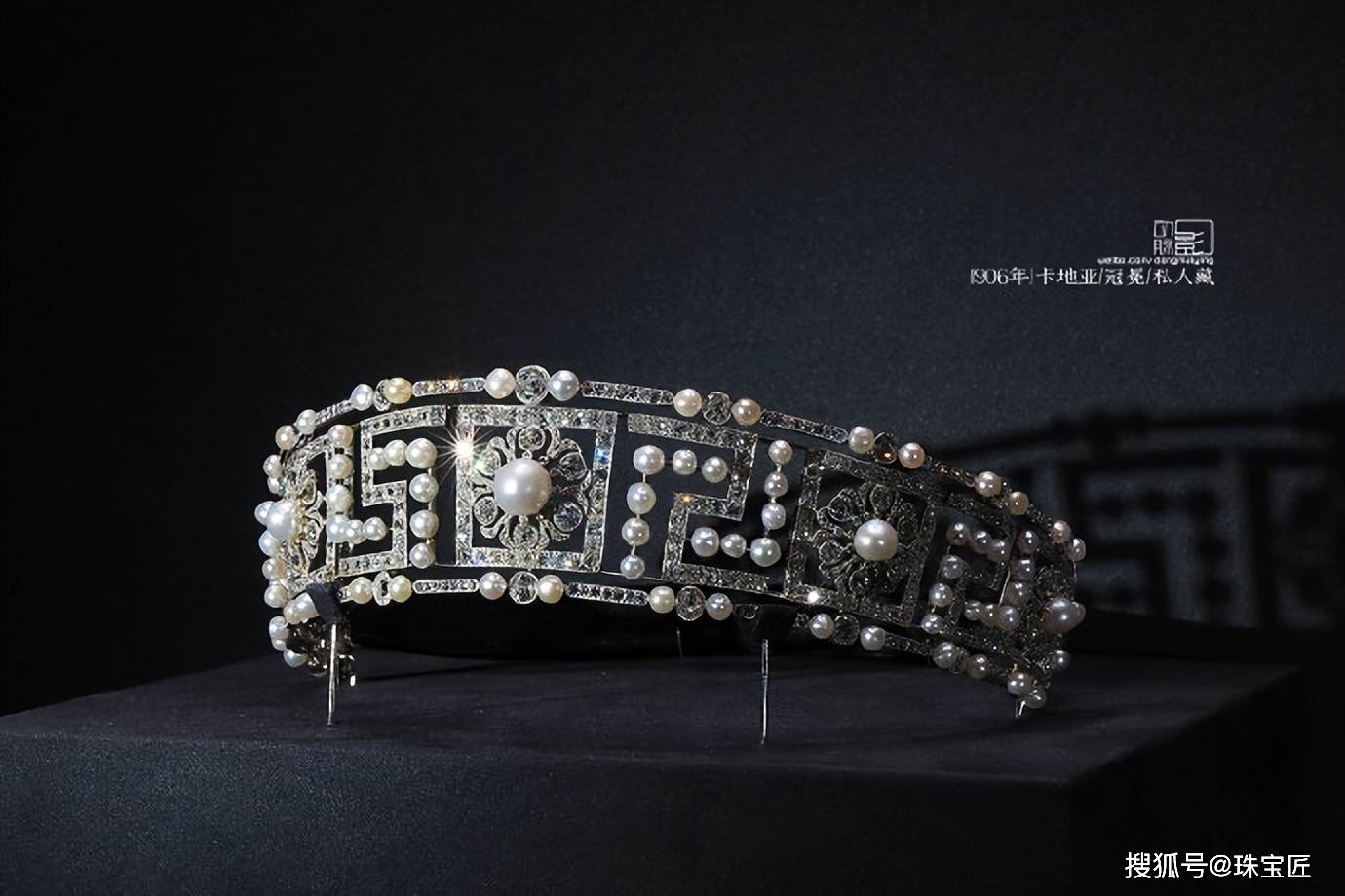 这顶冠冕制作于1906年,主体框架为铂金材质,珍珠与钻石镶嵌而成的回纹,不仅展现了东西方文化的融合,更体现了卡地亚设计师对美学的深刻理解和独特的创意。