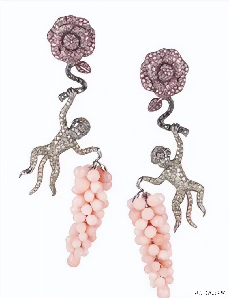 钻石镶嵌而成的猴子,一只手紧紧握住粉色蓝宝石镶嵌而成的花,另一只手拿着一串粉色蛋白石镶嵌而成的葡萄,造型别具一格,点缀在刘嘉玲的耳畔,也是别有一番风韵~