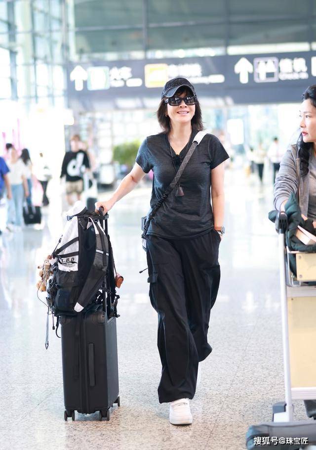 综艺开始录制前,她戴着墨镜,一身黑色休闲装、单手插兜亮相机场,身上虽无大牌高定珠宝点缀,但举手投足间尽显从容与洒脱,妥妥的“冻龄女神”!