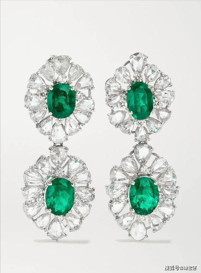 大小不一的水滴形祖母绿,搭配璀璨夺目的钻石,独特的镂空设计,使得整条项链更加轻盈、灵动,搭配上配套的耳饰、戒指、祖母绿手镯,更增添奢华与高贵,妥妥的“人间富贵花”!