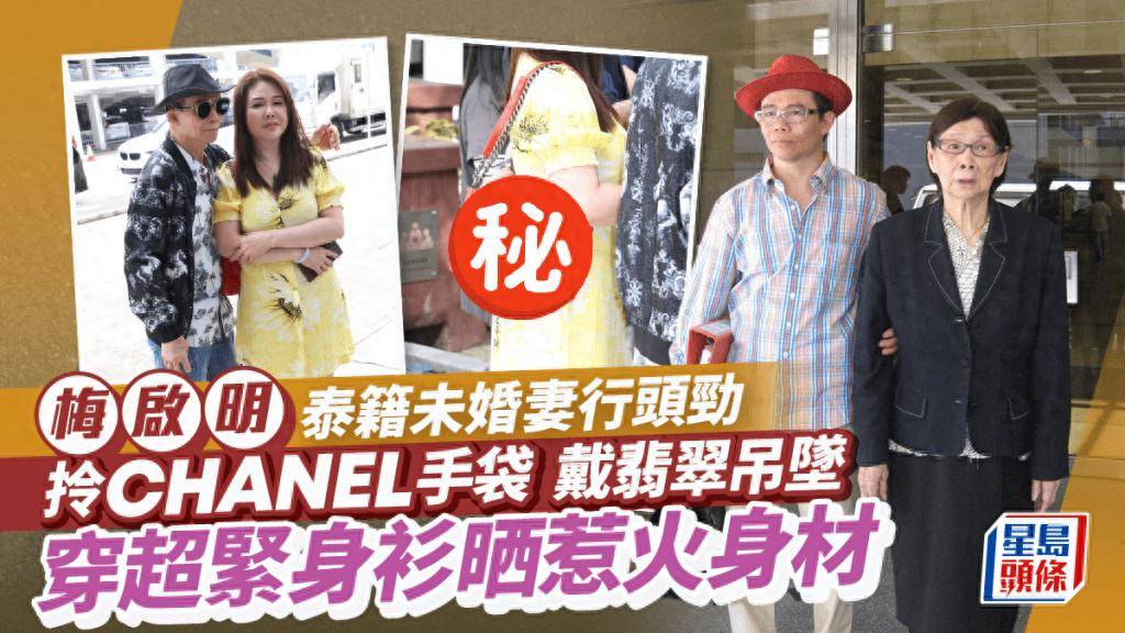 梅启明的泰籍未婚妻当天浓妆艳抹,身穿DeepV领黄色连衣裙,大秀丰满上围,但最吸引眼球的还是她佩戴的巨型观音翡翠吊坠。
