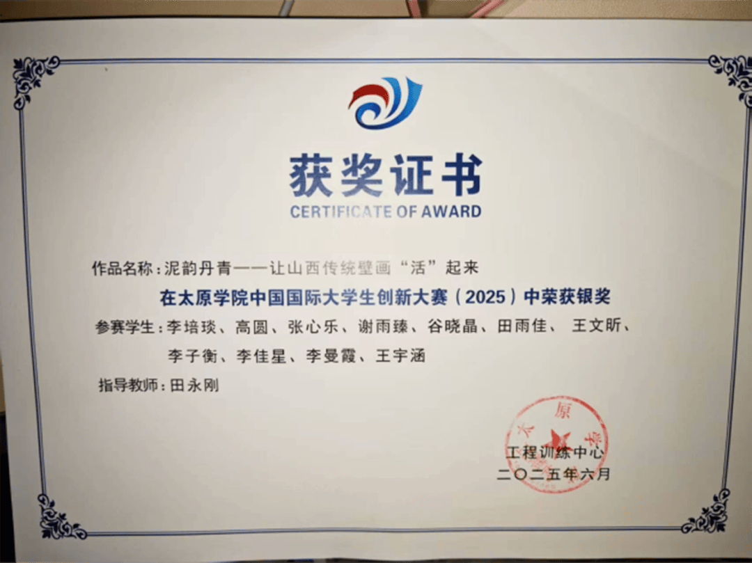 在2025年大学生创新创业大赛中,我们社团的《泥韵丹青——让山西传统壁画“活”起来》项目从百余支队伍中脱颖而出,斩获创新大赛银奖。该项目经长时间研发,融合传统文化和现代设计,以及环保理念,设计出符合年轻群体需求的装饰产品,经过这段比赛过程中不仅深化了专业知识,更锤炼了科研创新,团队协作等核心能力。