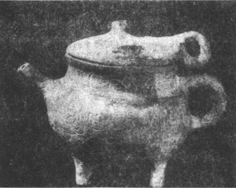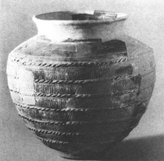 良渚文化的年代不是很确定,或说是距今四千年,有的人认为没有这么晚,也可能是距今四千五百年或是更早一点。一件上面是四个符号排在一起,一件上面是八九个符号排在一起,我记得李学勤先生到吉大去还专门讲过其中一个,觉得有可读性。我认为像这种现象其实不一定要逐个符号去读,为什么呢?因为当时真正的文字它不会刻在陶器上,特别是不会像丁公陶文那样刻在一片残陶片上。显然是陶器已经破了以后刻的,这上面刻了好多字有什么意义呢?没有意义。我拿一件在山东莱阳前河前村出的一件形式上是西周的仿铜陶盉来比较一下:
