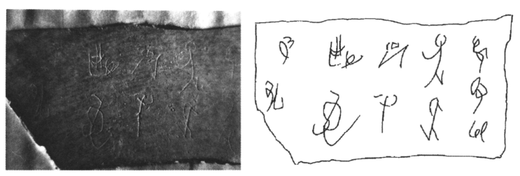 这边有一个像圆的头,然后有身子,下面有腿,像一个人,但是这个符号也没法念。我们大家都知道,在西周时期铜器上已经有成篇的铭文,为什么在陶器上会有这种现象呢?我认为做这个陶器的人他是仿铜器的,他知道铜器上面是要有铭文的。而这个做陶器的人不认识字,所以他就做出来一些像字不像字的东西放在这里,他认为也是一种装饰。我认为上举新石器时代晚期的陶文,实际上也是这种性质的东西。