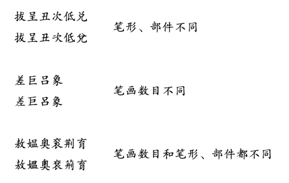 上面这一行是大陆用的,下面这一行是台湾用的。这样的字有195个。有的是相似形体,但细细看还是不一样;有的是笔形不一样;有的是基本的部件不一样;有的是笔画数不一样。都是很小的差别,但是就不一样。