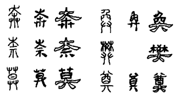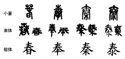 就是春字、奉字、秦字、泰字,顶上都是三横,一个人,这个也不知道叫什么旁,都变成一样了。它本来是完全不同的东西变的,就是说隶变把本来的结构也都破坏了。再举一个隶变当中的情况,就是什么东西都变成大: