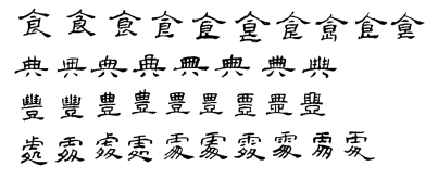 还有一个汉字的主要现象,因为它是意音文字,每个人都可以自己按照会意法、形声法去造字。意符、音符可以换,而且形声字还可以变成会意字,同一个字可以有很多种写法,那样结构性异体可以增加很多。还有一个就是笔画性异体更多,所谓“笔画性”就是写法稍微不一样,这样一来,异体字就很多很多。《汉语大词典》为什么有那么多字,其中有相当大的一部分就是异体字。比如在隶书里边,我们要写“食”字(是单个的食字,不是食字旁,食字旁还要多),不同的写法就有这么多: