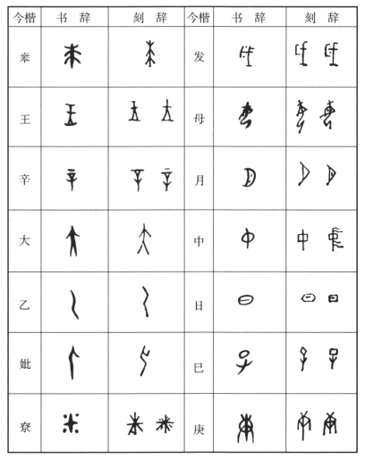 这一张表就是商代的毛笔字跟商代的甲骨文对照(下表)。商代人写字主要还是毛笔字这种样子,不是甲骨文的样子。现在不少写书法史的人一开始就说最早的书法就是刀刻的,这个我觉得很可笑。一开始书法还是毛笔写的,甲骨文只是一个特例。