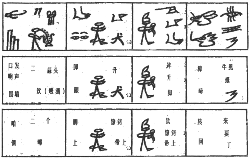 下图中第一行是东巴文《送情死者》的片段,图中第二行就是把上面那些符号做了解释,第三行就是应该怎么念。它就是一格代表一个句子。念法就是从上往下然后再往右边移过来再从上往下,我就不一一念了。比如拿第一句来说,这是画一个人的嘴,出来一个线条,那是表示口发的“啊”的音。它其实是一个声符,是用来记录纳西语的“咱”。下面是一堵围墙,发的音和“咱俩”的“俩”这个音是一样的。向右就是“二”,像汉语一样应该算指事字了。右旁的“个”是一个量词,这个量词画的是一个蒜头,大蒜,它发的音和纳西语的“个”一样。下面是一个人拿管子在吸酒。吸酒这个词的音就和感叹词“哪”是一样的,所以这样一些符号就可以念作“咱们两个哪”。这里面很多就是表音字,其他句子因为时间关系我就不一一说了。它还是没有成熟的文字,因为虽然这句很好,跟语言中每一词完全都对应了,后面各句却有多出来的东西。像这第二句还有点文字画的意思,中央是一个男人,他一只脚画出一个三角形,表示走。这个人脚上有个线条表示戴了脚镣。单单就是一幅图画就可以表示一个男人戴个脚镣在走,但是它又很地道地加上一只脚。记录“脚”这个词,又用一双眼睛记录纳西语的“上”的音。再画一个桶,这个桶是量米的升。这个升字和“镣铐”的音是一样的,那就用来记“镣铐”。“戴上”这个音和他们“狗”的音一样。这里没画一条狗,是借用汉字里面的犬字,是一个纯粹的记音字。那么念起来就是“脚上镣铐戴上”,中央这幅图画所表示的“男的”和“走”都是多出来的成分而不用念了。其实这一句有规定的念法“脚上铁镣戴上”,其中“铁”这个词并没有记录符号,而中央图形整个来说是多出来的,可以不要的,但是又起帮助理解内容的作用。所以这种文字还不成熟,还在文字画向文字过渡的过程当中。它在过渡过程当中已经出现了大量的表音字,才能比较好地记录语言。