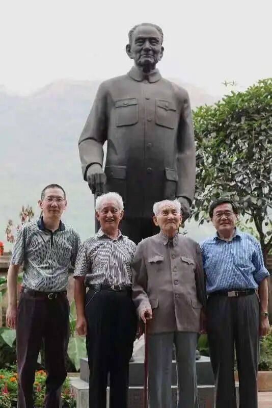 秦含章(右二)与季克良(左二)、高景炎(右一)及秦大文(左一)在秦含章塑像前合影