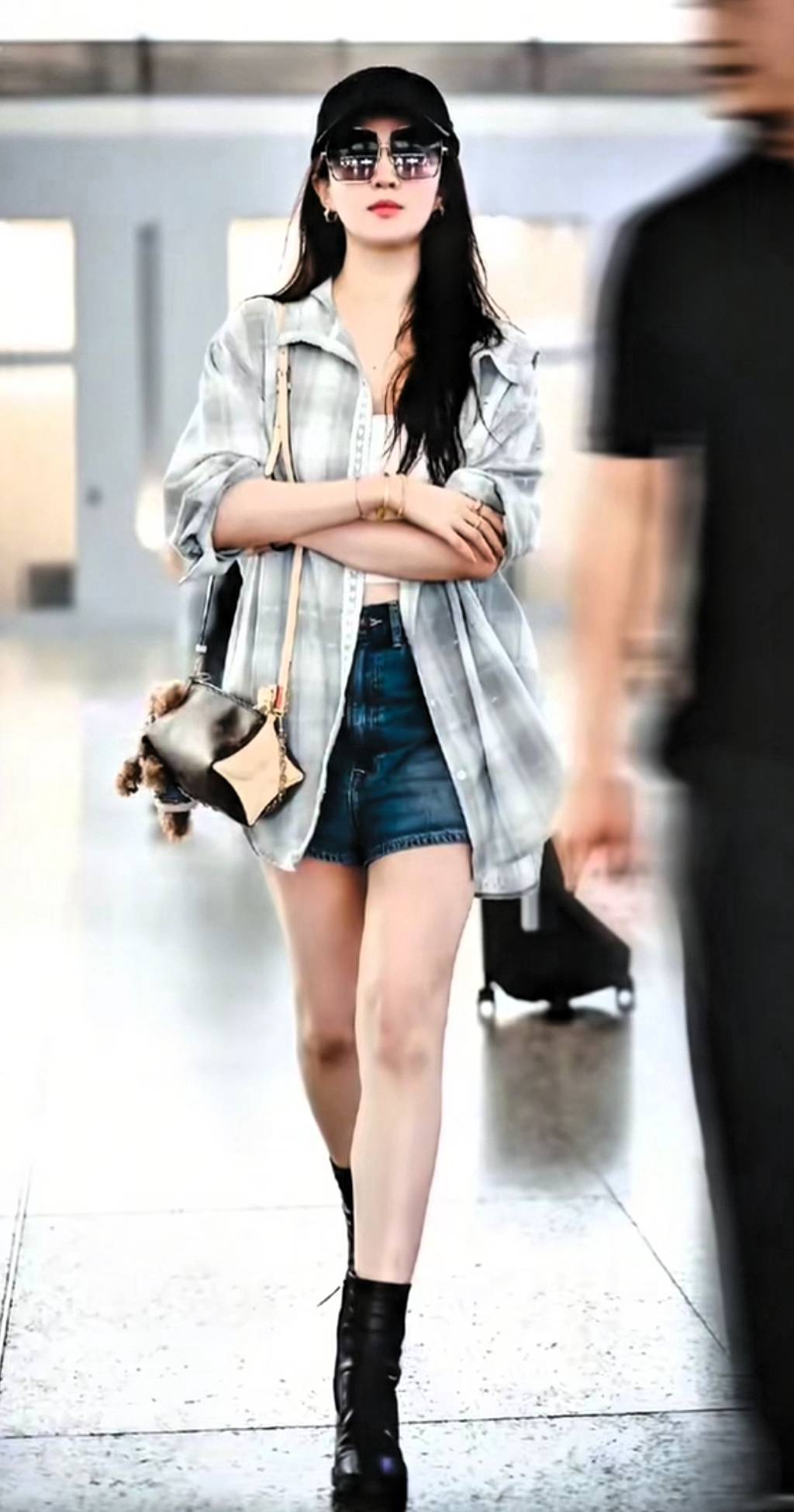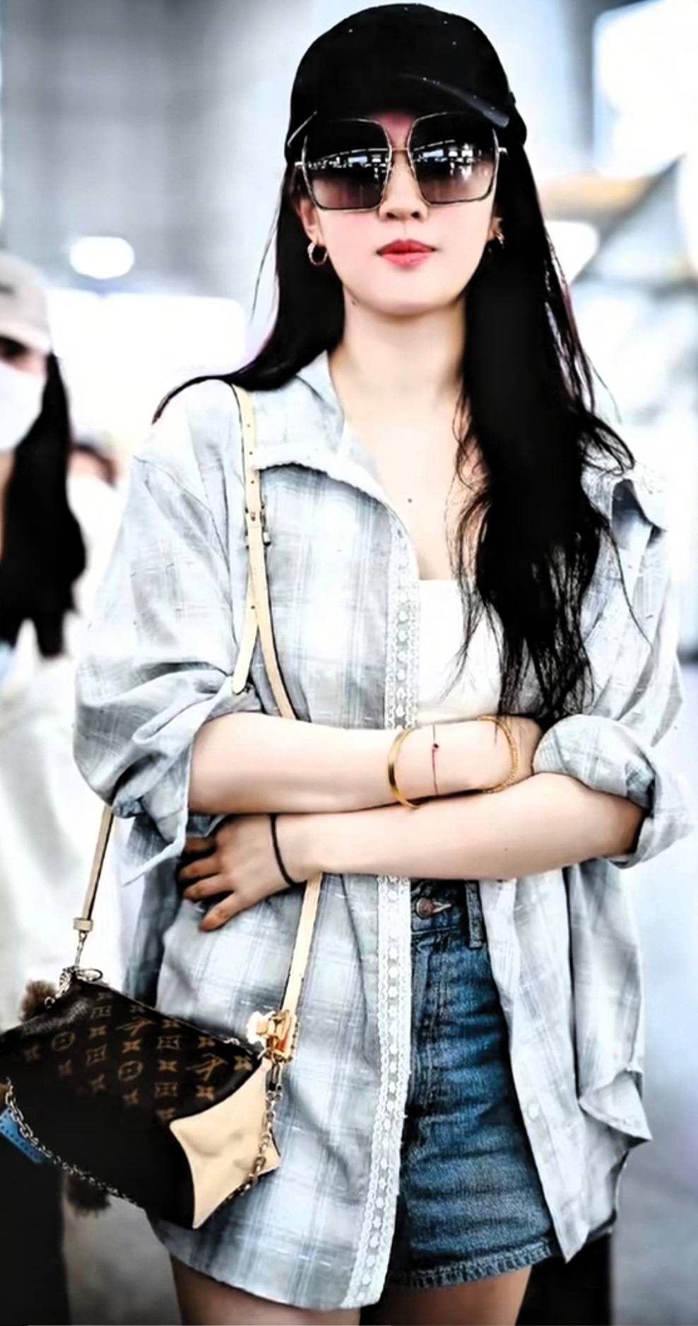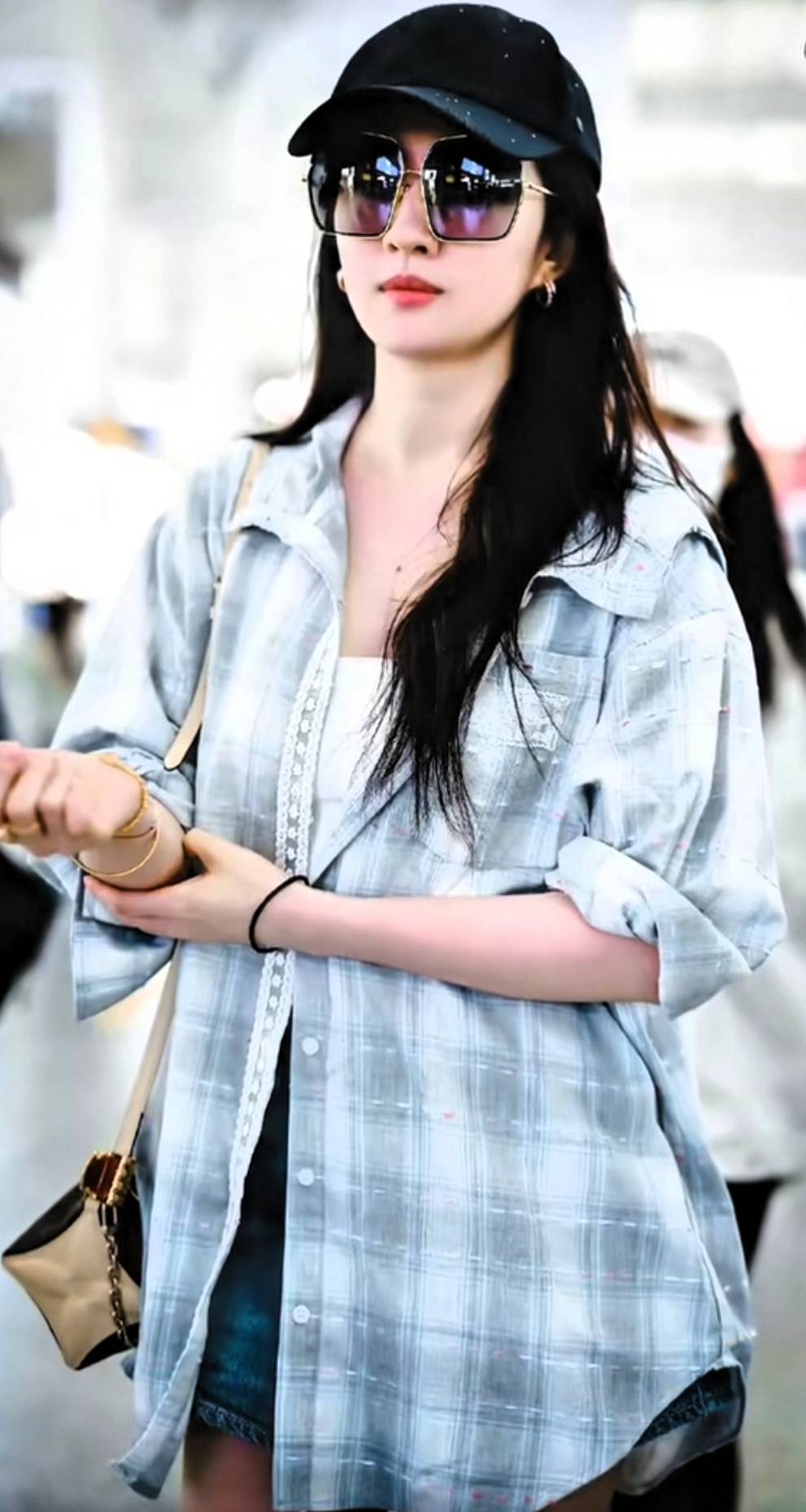 照片中的刘亦菲穿着一件简单的长袖衬衫,搭配浅蓝色牛仔短裤,整个人清爽自然,宛如夏日里的一阵凉风。她与工作人员低声交谈,笑容温暖,眼睛弯弯的,肌肤白皙透亮,长发随意披在肩上,仿佛仍然是那个不食人间烟火的小龙女。